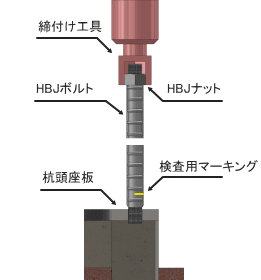 | ねじ孔付きの杭頭座板にHBJボルトを機械的に接合 することで杭とフーチングを接合し、信頼性の高い杭頭接合部を形成できます。 |